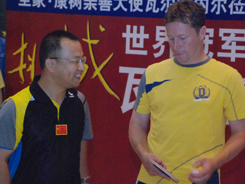 大眾網(wǎng)濟(jì)南6月20日訊 今天上午,素有“乒壇常青樹”之稱的瑞典乒乓球名將瓦爾德內(nèi)爾他作為圣象康樹品牌形象大使蒞臨濟(jì)南,和泉城球友切磋球技,親密互動(dòng)。圖為球友向“老瓦”討教。