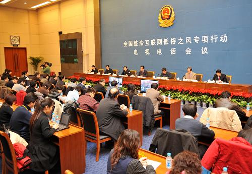 國務院新聞辦、工業(yè)和信息化部、公安部、文化部、工商總局、廣電總局、新聞出版總署等七部門1月5日上午召開電視電話會議,部署在全國開展整治互聯(lián)網(wǎng)低俗之風專項行動。國務院新聞辦副主任蔡名照主持會議并講話,強調(diào)要采取有力措施堅決遏制網(wǎng)上低俗之風蔓延,進一步凈化網(wǎng)絡文化環(huán)境,保護未成年人健康成長,推動互聯(lián)網(wǎng)健康有序發(fā)展。