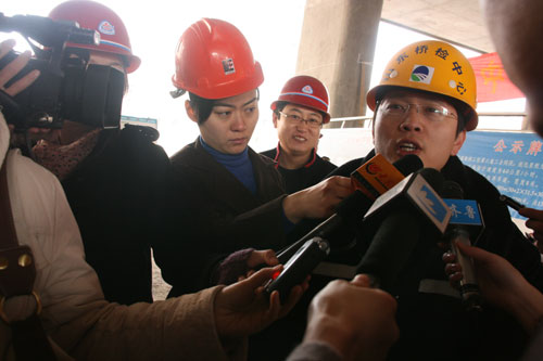 山東橋檢中心燕山立交抬升監(jiān)控負責人宣布大橋抬升數(shù)據(jù)合格,抬升到位。