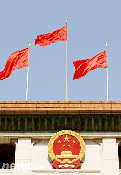 3月1日,人民大會堂上方鮮艷的五星紅旗迎風飄揚。2009年全國“兩會”即將開幕,各地代表、委員們已開始陸續抵京報到。新華網 文濤攝