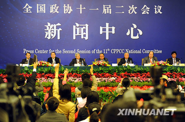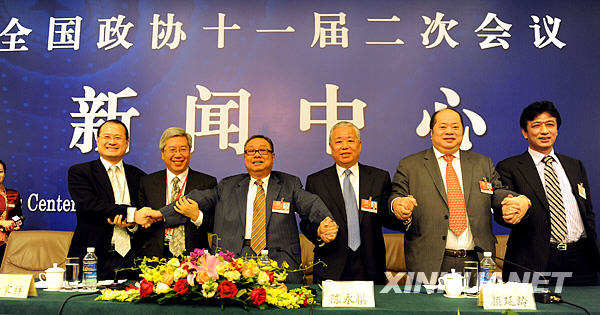 3月10日,全國政協十一屆二次會議在梅地亞兩會新聞中心舉行港澳委員集體采訪活動,主題是“港澳委員談如何應對全球金融危機”。蔡冠深、李家祥、陳永棋、顏延齡、張華峰、許健康等六位委員出席并回答記者提問。新華社記者謝環馳攝