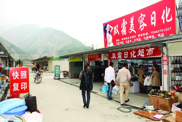 在映秀板房區(qū)的集貿(mào)市場(chǎng)里,各種生活、生產(chǎn)用品琳瑯滿目(5月1日攝)。