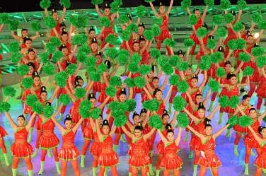 火紅的服裝,激情的動作,歡快的節奏。閉幕式上《拉拉操》節目動感時尚,韻律十足,臺上和觀眾席上的女孩...