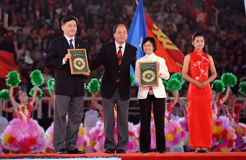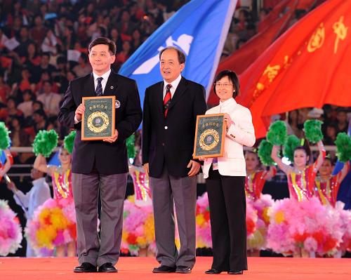 獲得參賽紀念獎的代表團代表在閉幕式上領獎。 新華社記者李紫恒攝