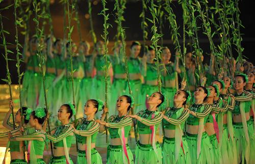 10月28日,第十一屆全國運動會閉幕式在山東濟南舉行。這是閉幕式上的歌舞表演《風擺荷柳》。新華社記者朱崢攝