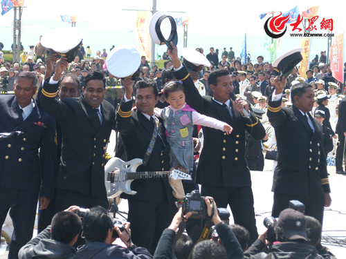 大眾網(wǎng)青島4月21日訊(特派記者 馮煒程)“沒有什么能夠阻擋,你對自由的向往……”,21日上午,當(dāng)孟加拉海軍士兵用并不熟練的漢語唱出許巍的這首《藍(lán)蓮花》時,在場的數(shù)千中國觀眾幾乎同時做出了驚奇又感動的表情,因?yàn)樗麄儧]有想到這樣一首連很多中國人都并不熟知的流行歌曲會從孟加拉士兵嘴中吟唱出來,而且唱得那么投入。