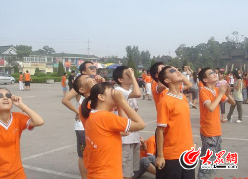 大眾網濟寧7月22日訊(記者 陳宏發 通訊員 朱斌) 500年一遇的日食奇觀引起了人們的極大觀看熱情,今早8時,孟子故里鄒城市不少市民走出家門,來到孟廟廣場觀看這一天文盛宴。來自附近一學校更是組織學生集體來廣場觀看日食,希望能豐富學生的暑假生活,激發他們對天文知識的熱愛。圖為學生們帶著自制的“日食眼鏡”在孟廟廣場上看日食。