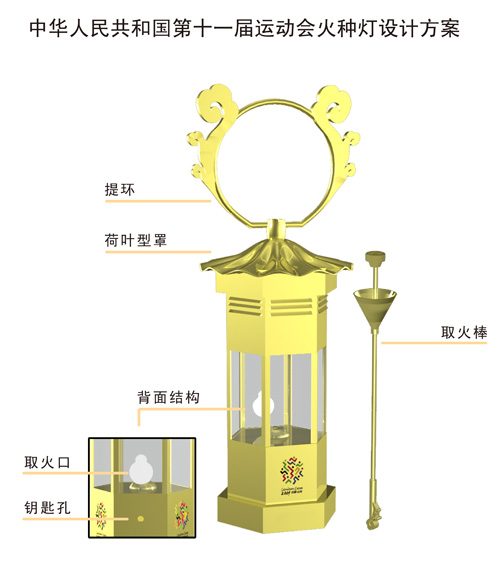 火種燈外觀設計八易其稿,進行數十次的生產試驗,在火種燈選材,噴涂、隔熱、安全等方面克服了許多科技難題,最終誕生了“如意宮燈”這件具有深厚文化積淀,又有著全運會舉辦地濟南“四面荷花三面柳”的城市特色作品。