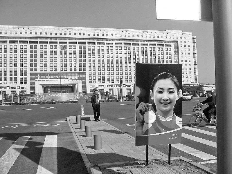 何雯娜的巨幅頭像立在了奧體中心龍鼎大道最北頭。記者 丁捷 攝