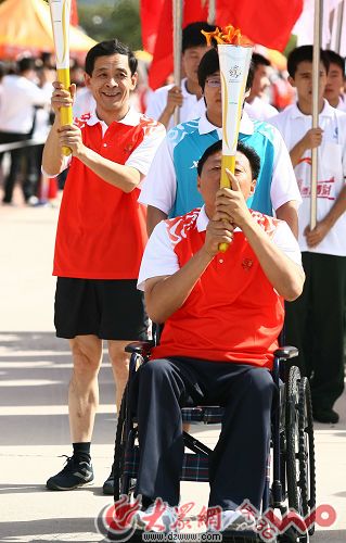 殘疾人鄭金波坐著輪椅參加火炬傳遞