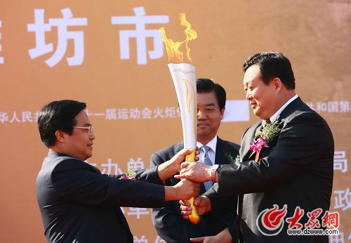 濰坊市委書(shū)記張新起將火炬交到市體育局局長(zhǎng)耿文手中。