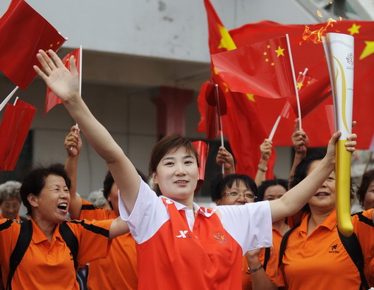 8月20日,第五棒火炬手、短道速滑名將張晶手持火炬向人們揮手致意。當日,第十一屆全運會火炬傳遞在吉林省長春市五環體育館完成了第五站的傳遞。新華社記者王昊飛攝