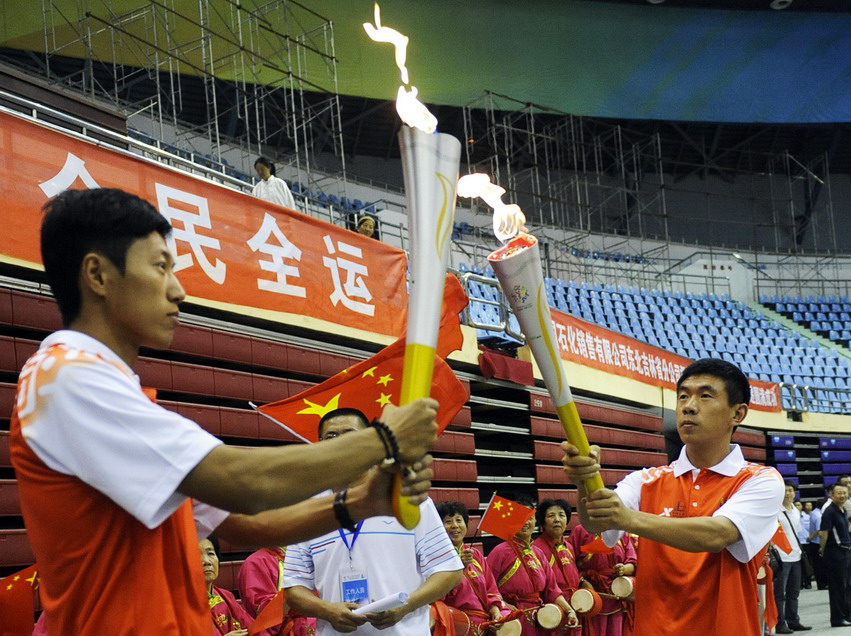 8月20日,第一棒火炬手、短道速滑名將李佳軍(右)點燃第二棒火炬手孟巖的火炬。當日,第十一屆全運會火炬傳遞在吉林省長春市五環體育館完成了第五站的傳遞。