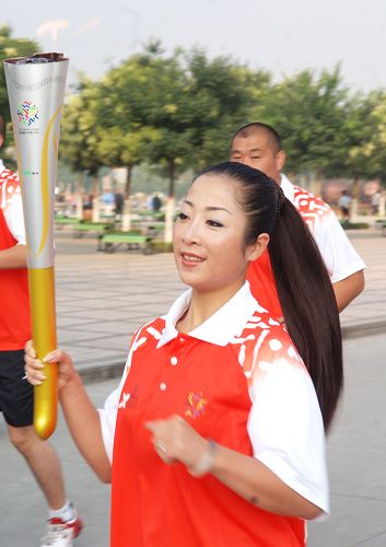 火炬手、全國健身小姐冠軍邱亞娟在進(jìn)行傳遞。