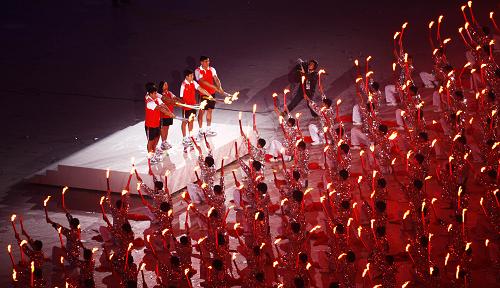 火炬手王皓、黃金寶、周玉新、呂曉磊和張小平準備點燃主火炬。