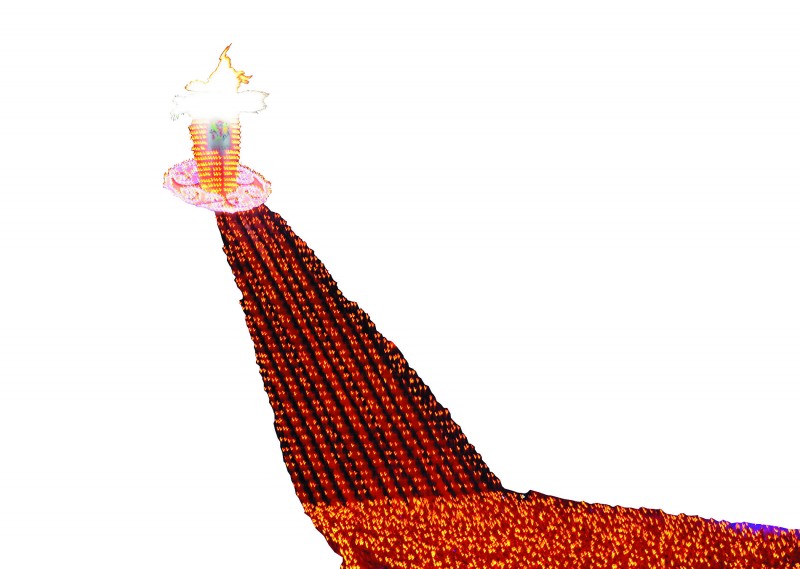 伴隨著十一運開幕式演出漸近尾聲,萬眾矚目的高潮終于出現——誰將點燃十一運會主火炬塔?在此之前,很多人對這個問題進行了這樣或者那樣的猜測,但是沒有人能夠想到十一運開幕式主創團隊會采取這樣的方式——當最后的幾名火炬手站在位于濟南奧體中心場地南側的領獎臺上,手持火炬彎下腰去之時,場地內近5000名參演人員按照橫向排面為標準,逐一單膝跪地,上身后仰,打開身上攜帶的煙火,全運圣火一排排由南向北“傳遞”,最終,位于濟南奧體中心北端的主火炬塔燃起熊熊圣火(上圖),這一幕令所有的觀眾均感到格外震撼。