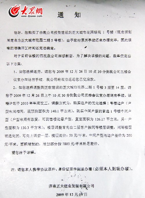 原定的本月20日開發(fā)商向業(yè)主進行“最后解釋”,卻被臨時取消。大眾網(wǎng)記者繼續(xù)跟蹤報道,19日,開發(fā)商終于向每位業(yè)主寄出了一份書面《通知》,這也是三年來濟南正大建業(yè)首次正面回答業(yè)主,并提出了明確的處理意見。