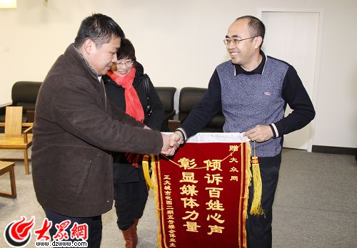 今天下午,業主代表李先生和張女士對大眾網為民報道、伸張正義的舉動表示感謝,也對大眾網記者的職業精神和素養表示敬佩,將寫有“傾訴百姓心聲,彰顯媒體力量”的錦旗贈送到大眾網總編輯、總經理潘子江的手中。