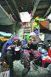 每天上午,孫法菊都要先把老母親安頓好,然后才出去拾荒!岸炝,天氣比較冷,我起來得比較晚!