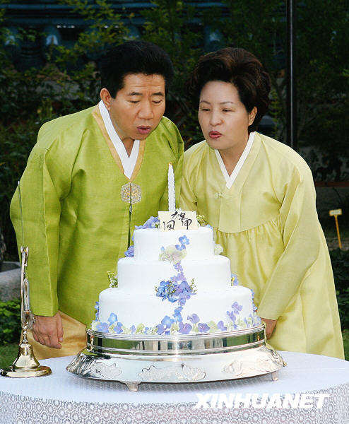這是2006年9月23日,在韓國首爾總統官邸青瓦臺,韓國前總統盧武鉉和夫人權良淑一同慶祝他60歲生日。