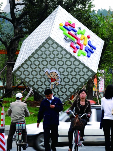 ▲濟南街頭帶有全運會吉祥物和會徽的雕塑矗立在街頭顯著位置。