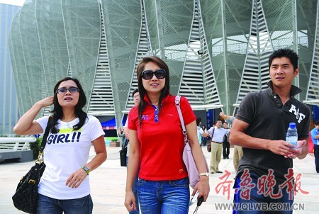 郗恩庭(持相機者)給漂亮的全運場館留張影。