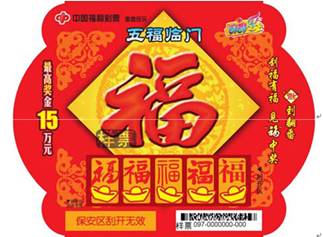 號稱“福”票的刮刮樂即開彩票“五福臨門”的最大特點,就是整款彩票洋溢著濃濃的“福氣”。中國人講究“福”,喜慶節日要“祝福”,過春節家家戶戶要貼“福”字,贊美別人說“有福”,自己快樂叫“幸福”,祝福別人“福如東海”、“五福臨門”,那就是最大的祝福了。“五福臨門”的整體造型像一個大紅燈籠,又像一個腰鼓,胖乎乎的很富態,這容易讓人浮想這樣一個場景:在一個好天氣,到處都掛著大紅燈籠,人們快樂的敲擊著腰鼓,慶祝一個五福臨門的日子。“五福臨門”彩票的正中是一個大大的“福”字,“福”字上面寫著“五福臨門”四個大字,“福”字下面的刮開區分寫著五個不同字體的“福”,“福”字右邊寫著“刮福有福,見‘