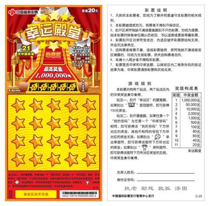 該款彩票面值20元,頭獎100萬元,中獎面為36.28%,獎級11級,共有21次中獎機會。