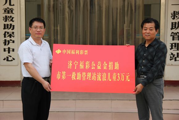 圖為濟(jì)寧市福彩中心負(fù)責(zé)人向濟(jì)寧市流浪兒童救助中心捐贈(zèng)資助金