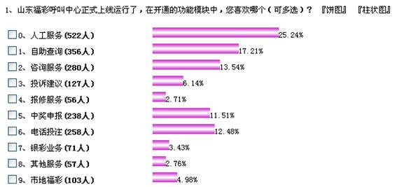 在山東彩票網站開展的網上調查中,在現有熱線開通的功能模塊中,多數彩友參與了此項活動,在諸多功能中,多數彩友還是贊同人工服務這個選項,自助查詢也比較受歡迎。