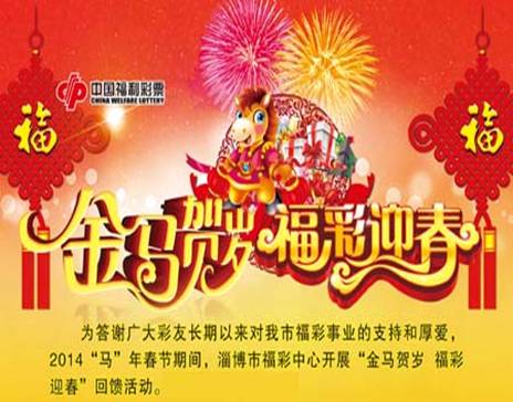 為答謝廣大彩友長期以來對淄博市福彩事業的支持和厚愛,2014年馬年春節期間,淄博市福彩中心針對電腦票隆重推出“金馬賀歲 福彩迎春”大型回饋活動。