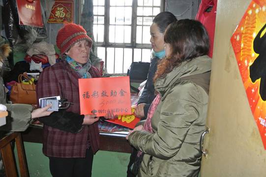 柳忠素接到煙臺福彩中心愛心團隊送來的3000元救助款和米、油等生活用品感動得熱淚盈眶