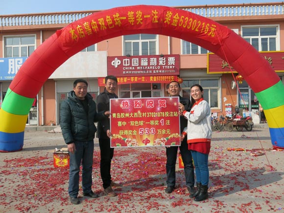 此次中出“雙色球”第2014017期533萬大獎的福彩37021078投注站位于青島膠州市大西莊村,幸運彩友以自選復式的投注方式攬獲大獎。