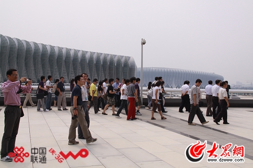 大眾網濟南8月21日訊   21日下午,第五屆中國網絡媒體山東行一行近百人開始首站在山東省會濟南的采訪行程,當天下午最讓采訪團興奮的,就是大家走進了即將在10月成為全運會的主會場的濟南奧體中心,提前感受了“東荷西柳”的魅力。在參觀過程中,各地網絡媒體的代表們稱贊奧體中心在場館建設、文化內涵和可持續使用上都十分出色。