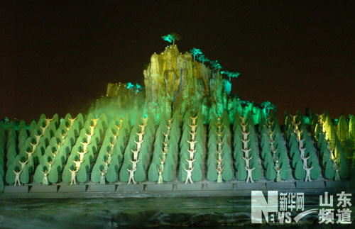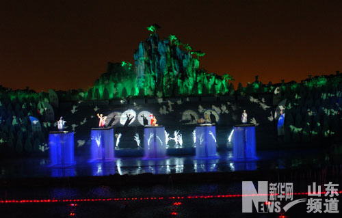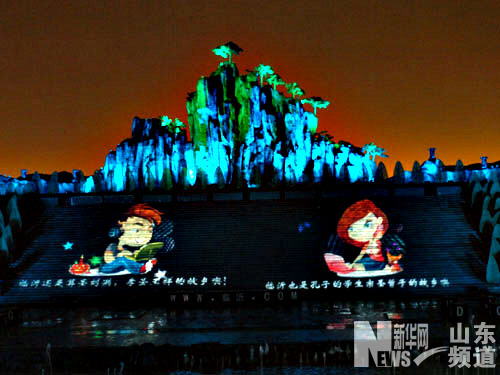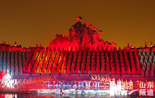 8點整,燈光投影在水幕上方出現(xiàn)了“蒙山沂水”四個流金大字,拉開了整晚演出的序幕。演出以臨沂歷史為縱向主線,展示了從書圣王羲之、諸葛亮?xí)r代臨沂地靈人杰、英雄輩出的歷史畫面,縱跨到臨沂經(jīng)過30年改革實踐后所展現(xiàn)的"老區(qū)新顏"。