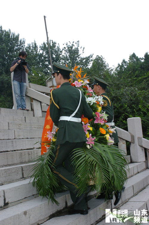 采訪團首先向位于臨沂城區金雀山腳下、沂河西岸的華東革命烈士陵園敬獻花籃,該陵園是紀念在抗日戰爭和解放戰爭中犧牲的華東地區革命烈士而建,是華東地區最大的革命烈士陵園,開國元勛粟裕骨灰撒放在此處。