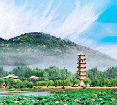 九頂蓮花山,橫看象一條巨龍逶迤騰飛。觀音閣高聳在蓮花山最高峰,巍峨莊嚴,是求福求子的佛教道場;登閣遠眺,湖光山色,盡收眼底,小城春秋,一覽無余。山東麓,蒼松翠柏郁郁蔥蔥,火炬松濤香氣襲人;山西麓,林密徑幽清雅別致,栗園秋實碩果累累;大觀亭、鳳凰亭,亭亭玉立,攬勝閱春,風光無限;一線洞天、鱷魚出水、猿人沉思、金鰲聽禪等景點情趣盎然。