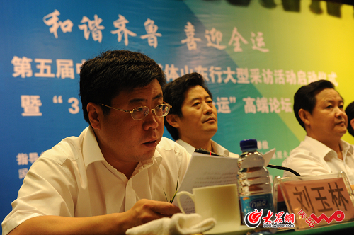 大眾網8月21日訊 第五屆山東網絡媒體山東行今天上午在濟南正式啟動,國內40余家主流網媒體共80多名記者參加活動。圖為中國聯通山東分公司副總經理劉玉林出席儀式。