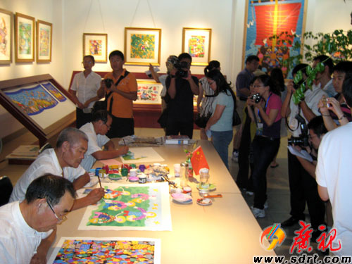 廣視網8月24日訊 (記者:彭芳) 24日下午,“聯通杯”第五屆中國網絡媒體山東行代表團成員來到日照市文化藝術博覽中心參觀。鄉土氣息濃厚的農民畫和歷史悠久的黑陶文化成為大家關注的焦點。大家紛紛表示,文化藝術博覽中心必將激發廣大文化文藝工作者創造出更多更好的文化文藝精品,進一步促進傳統文化向市場化、產業化發展。