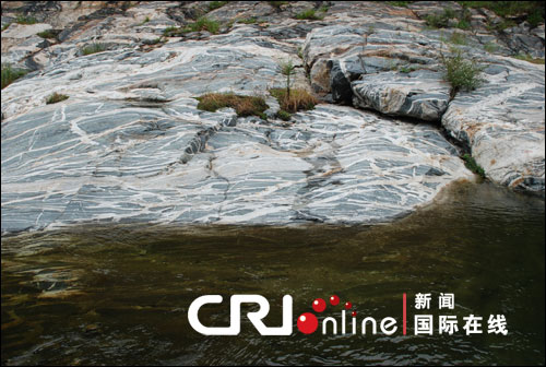 當日的天氣雖不是陽光燦爛的晴朗天,但雨后的濕氣和霧氣更平添了一許浪漫的氣息,讓整個景色更具中國水墨畫的意境。一踏進彩石溪,不禁感嘆大自然的鬼斧神工,溪中流水之下忽如彩石鋪就,溪底一條條石紋五彩紛呈,陽光照耀下,分外生動,在近萬平方米的浮巖石坪中,溪水、彩石交融,像一幅天然的畫卷,亦夢亦幻。