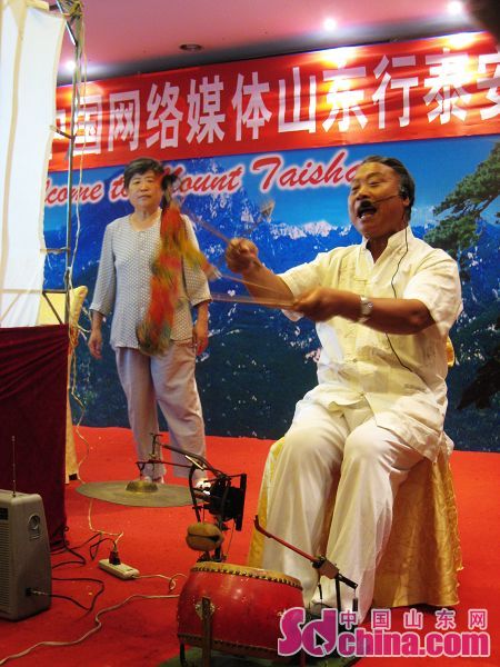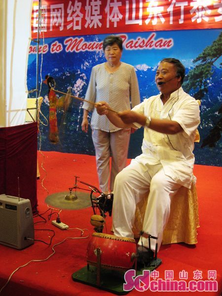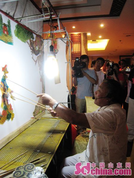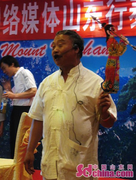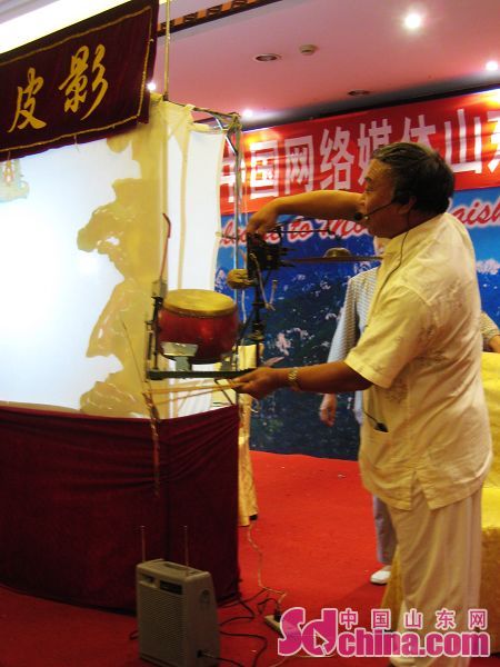 22日,第五屆網(wǎng)絡(luò)媒體山東行記者采訪團(tuán)在泰安采訪,期間,記者們有幸觀看到了由非物質(zhì)文化遺產(chǎn)傳承人范正安老先生表演的“十不閑”泰山皮影戲。