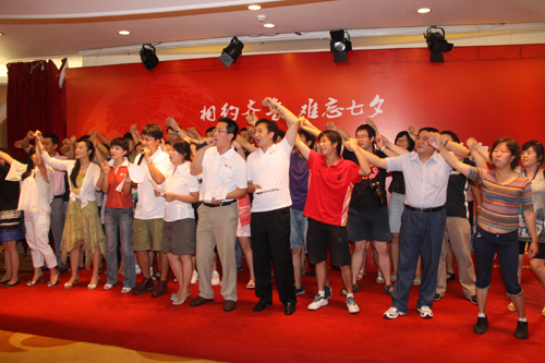 26日中午,第五屆網絡媒體山東行采訪團繼續在青島考察采訪,當天適逢我國傳統節日七夕節,組委會在青島府新大廈舉行迎七夕活動,其間,來自全國各地的網絡媒體記者共同上臺,一起唱起那首熟悉的《明天會更好》,祝福偉大祖國的60華誕,祝愿祖國繁榮昌盛,人民生活幸福。