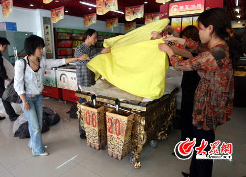 大眾網(wǎng)濟(jì)南5月4日訊(生活日?qǐng)?bào)記者 楊黎明 大眾網(wǎng)記者 劉寶才 實(shí)習(xí)記者 隋喬)5月4日下午2點(diǎn),山東濰坊的李濱先生提供的兩個(gè)奧運(yùn)缶運(yùn)抵濟(jì)南七里堡茶城。“擊奧運(yùn)缶喝北川茶”,奧運(yùn)缶將于明天在“北川茶愛心推介會(huì)”與廣大市民見面。