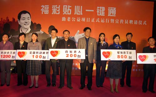 4月14日上午,濟南“貼心一鍵通”正式運行暨宣傳員聘請儀式上,省市領導和公益宣傳員濮存昕向受贈單位及家庭代表贈送呼叫器。