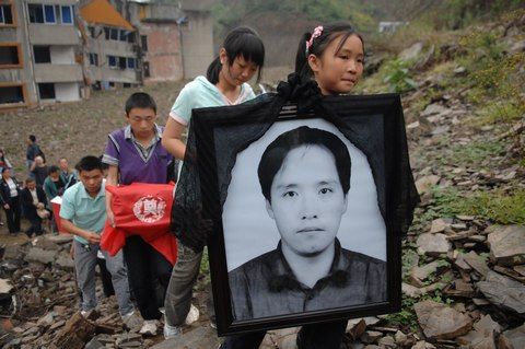 人民網4月23日報道 “假如,某一天,我死了,兒子,那是我最幸福的事,我會讓你媽媽,把我的骨灰,撒在曲山小學的皂角樹下,爸爸將永遠地陪著你,不棄不離……”這是北川宣傳部副部長馮翔博文中的一段話。2009年4月22日下午,為了遵循馮翔的遺囑,他的骨灰在親屬的護送下來到北川老縣城,被埋在曲山小學的廢墟下,而馮翔兒子的遺體正是壓在了該廢墟底下。