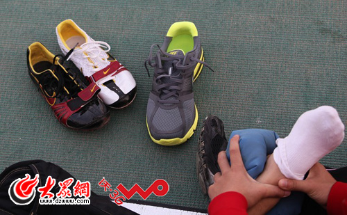 劉翔訓練穿了一雙雙色釘鞋,訓練完后他對右腳進行了冰敷。大眾網記者楊博 攝