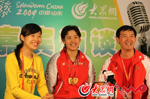 大眾網(wǎng)-聯(lián)通3G聯(lián)合報(bào)道10月24日訊(記者 隋喬 趙洪棟)今天上午,陳倩與教練王愛民一起做客大眾網(wǎng)奧體中心直播間。十六歲的她還很羞澀,微微頷首,表現(xiàn)得非常低調(diào)。她小聲說道:“游出這個(gè)成績我非常開心,發(fā)揮出了我最好的水平,這也是參加這次比賽的目標(biāo)。”她脖子上戴的三塊金牌,不時(shí)碰撞發(fā)出叮叮當(dāng)當(dāng)?shù)捻懧暋2恢侨龎K金牌比較有重量,還是性格靦腆羞澀,陳倩總是微微低頭,照相的時(shí)候才展露一個(gè)陽光的笑容。