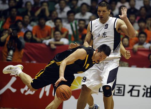 10月28日,廣東隊(duì)球員朱芳雨(下)突破山東隊(duì)球員巴特爾的防守。當(dāng)日,在第十一屆全國(guó)運(yùn)動(dòng)會(huì)男子籃球決賽中,廣東隊(duì)以81比76戰(zhàn)勝山東隊(duì)獲得金牌。這是本屆全運(yùn)會(huì)產(chǎn)生的最后一塊金牌。