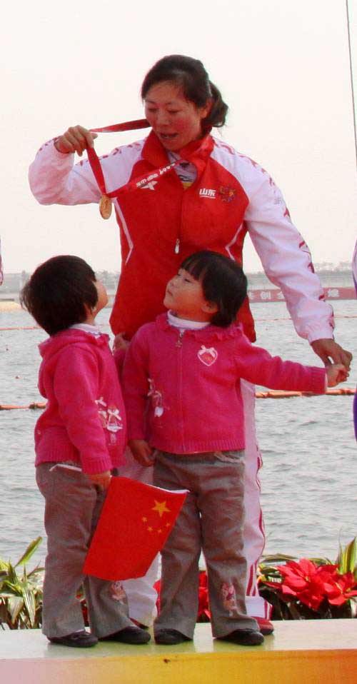 上岸后的徐淼,摟著女兒,左親一個右親一個,眼中滿是慈愛,完全忘記了金牌的事。“為了備戰全運會,我從去年11月份就沒有回家看女兒”,參加過5屆全運會,八運會和九運會都拿過金牌的徐淼當舵手已經有18個年頭。18年里,回家的次數屈指可數,結婚后跟丈夫也是聚少離多,“在家呆最長的一次,恐怕是懷孕生孩子的時候,如今孩子三歲了,完全是丈夫照看,既當爹又當媽”。說到這里,徐淼低頭看看兩個可愛的女兒,幸福中透著一絲愧疚。