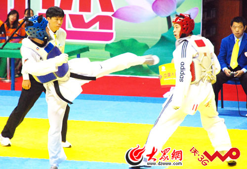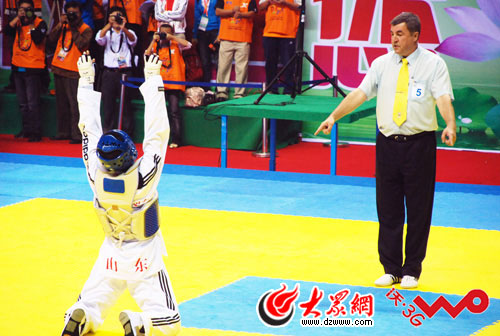 大眾網(wǎng)9月11日訊 十一運會跆拳道比賽今天繼續(xù)在山東滕州體育中心體育館進行。在男子80公斤級比賽中,山東選手趙林以4:3戰(zhàn)勝浙江選手王浩,奪得金牌。在今天的比賽中,趙林先后以8:7、3:2、2:1分別戰(zhàn)勝河北王廣帥、遼寧李生、解放軍朱國后進入決賽。